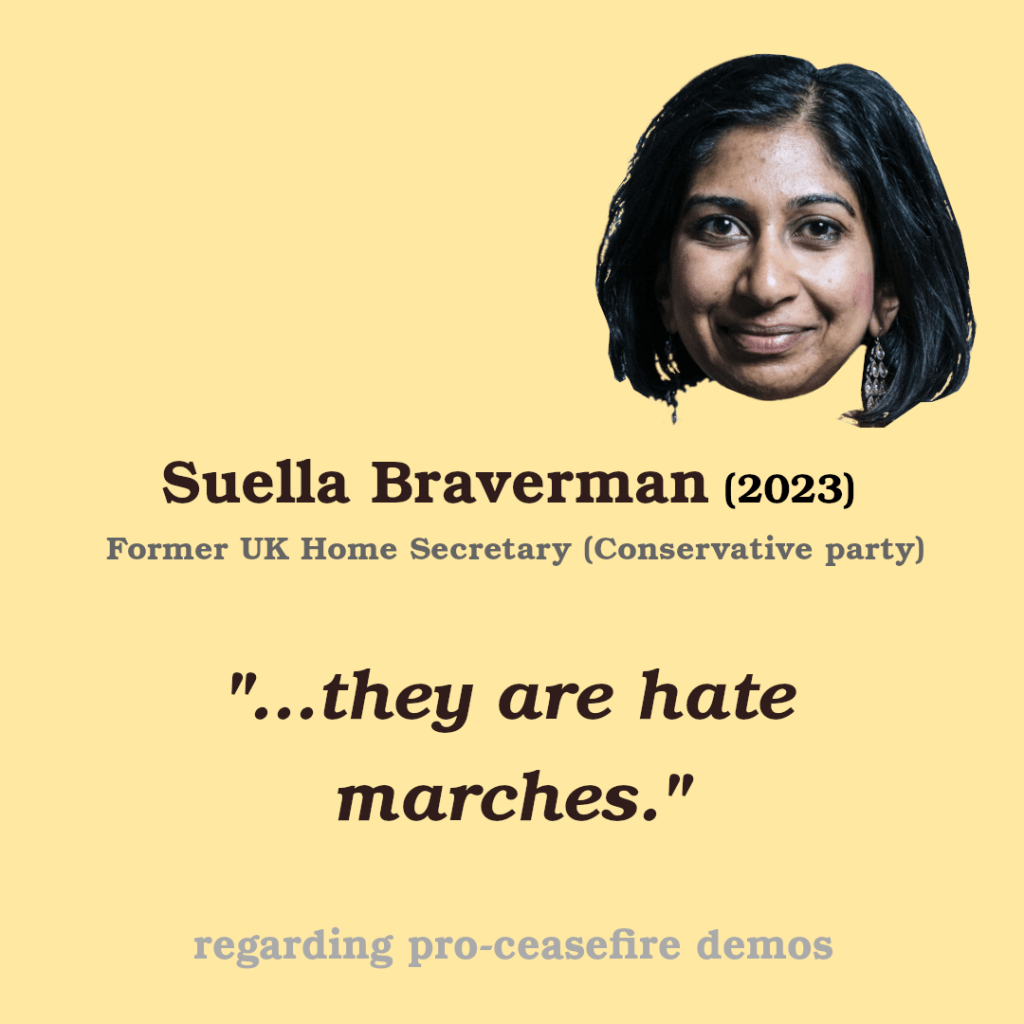“Braverman Slammed after Calling UK Pro-Palestine Protesters “Hate Marchers.”” Al Jazeera, 9 Nov. 2023, http://www.aljazeera.com/news/2023/11/9/braverman-slammed-after-calling-uk-pro-palestine-protesters-hate-marchers.